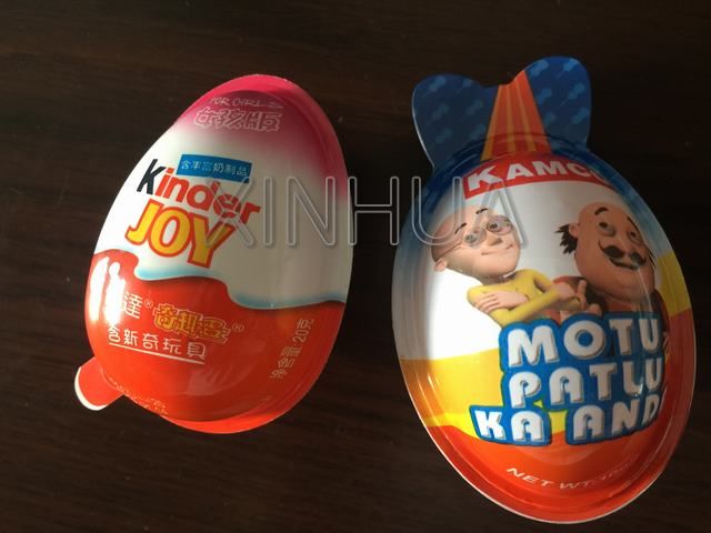 This machine is exclusively used in colorful plastic sheet forming, filling, sealing and cutting, it is suitable for the packaging of chocolate paste, margarine, candy, biscuit, toy and etc., The packed products (like cartoon animal, cartoon car, kinder joy egg..) with excellent 3D appearance and looks high class, is the best choice for the high class confectionary, dally use chemical, toy manufacturing enterprise.