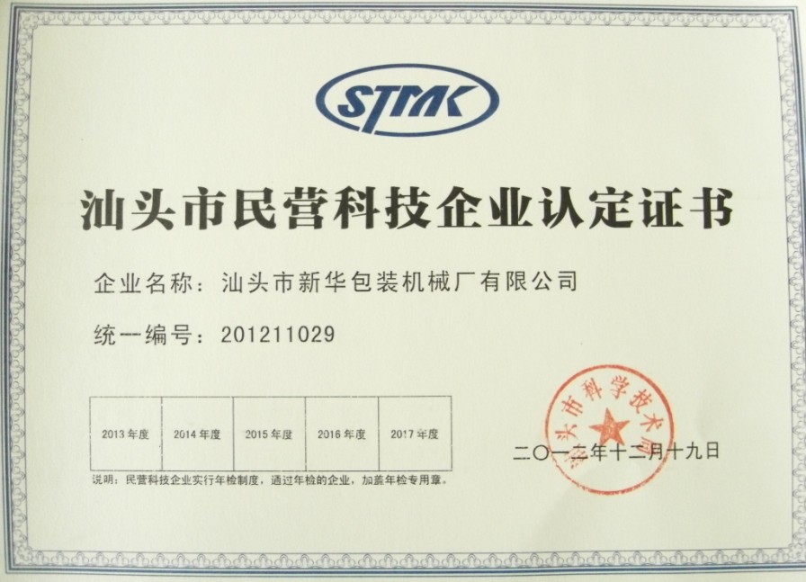 2012年12月19日,汕头市新华包装机械厂有限公司被汕头市科学技术局认定为“汕头市民营科技企业”。
